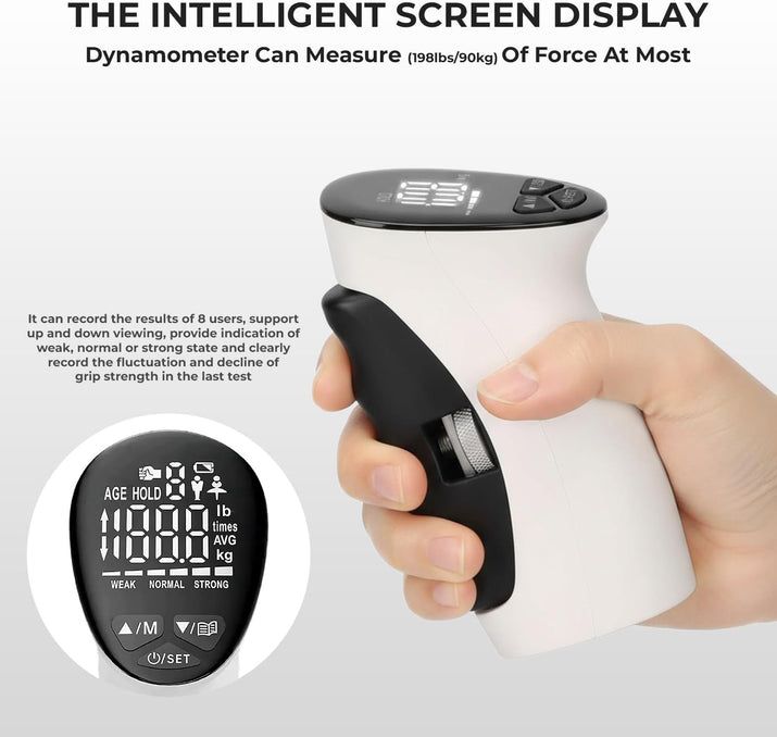 Answer 1: The electronic hand dynamometer can measure grip strength up to 90 kilograms, allowing it to accommodate a wide range of users and performance levels.